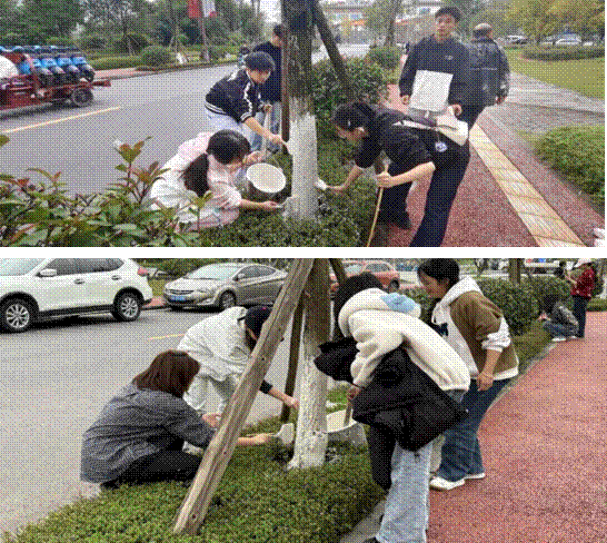 11月16日午后增加“在玉阶泸州玉阶景观园林有限公司指导下”,我校园林协会协会策划的“冬日护绿 · 白装暖树”树木涂白活动,在校园红星桥至酒城文化创意美食街开启。活动集结了30 名同学,开场时协会组织人员以“小树的冬日防护课”为主题,用生动比喻拆解了涂白的多重作用:既能隔绝低温、抵御害虫产卵,又能利用白色反光避免昼夜温差冻伤树皮,连“让校园冬景更整洁”的美学价值也一并讲透,让同学们直呼“给树穿白装原来这么有讲究”。