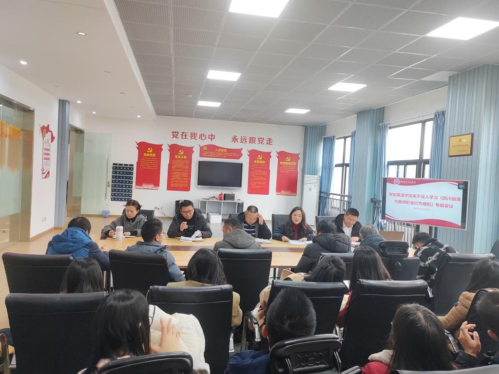 为深入贯彻落实新时代师德师风建设要求,引导全院教师明确职业行为准则、培养高尚师德情操,2025年12月25日下午3点在弘义楼7215会议室召开专题学习研讨会,会议集中学习《四川省高等学校教师职业行为细则》(以下简称《细则》)。学院党总支副书记、院长胡丹萍主持领学,党总支书记郑忠标作总结部署讲话,学院全体教职工参加会议。